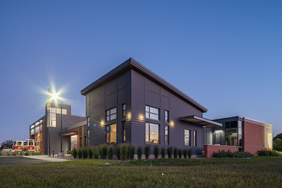 The architecture features a day room, kitchen, turnout lockers, fitness room, bunk rooms, and a storage mezzanine. The exterior design incorporates materials that express the permanence of the station. Respectful of the neighborhood residences, the drive-through apparatus bays are located at the rear of the hilly site to reduce noise naturally.